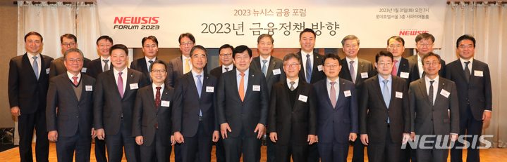 기념촬영하는 2023 뉴시스 금융 포럼 참석자들