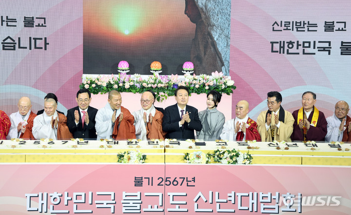 신년대법회 신년 세리머니하는 윤석열 대통령 내외