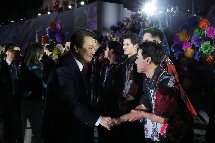 공연자들 격려하는 윤석열 대통령