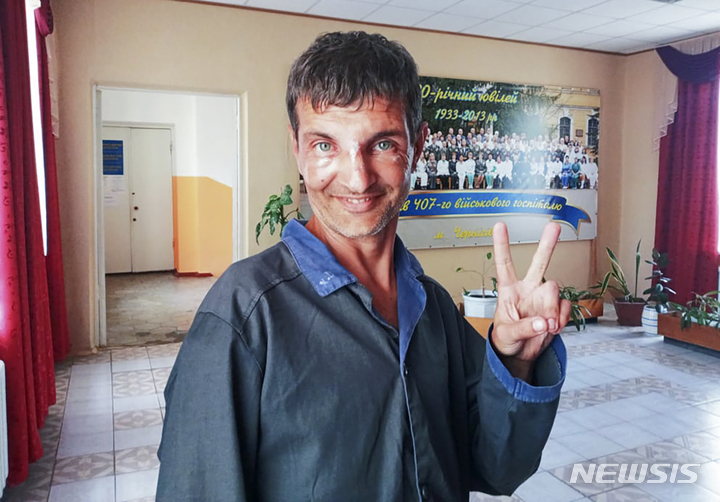 [체르니히우=AP/뉴시스] 러시아와 우크라이나의 포로 교환으로 석방된 한 우크라이나 군인이 22일(현지시간) 우크라이나 체르니히우 시립병원에서 V를 그리고 있다. 2022.09.23.