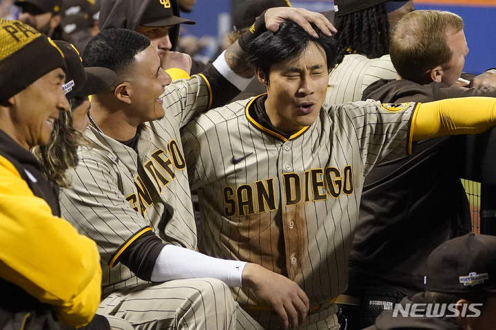 [플러싱=AP/뉴시스] 샌디에이고 파드리스의 김하성이 9일(현지시간) 미 뉴욕주 플러싱의 시티필드에서 열린 2022 메이저리그 내셔널리그(NL) 와일드카드 결정전(NLWC) 뉴욕 메츠와의 3차전 4회 초 득점 후 더그아웃에서 매니 마차도로부터 환영받고 있다. 2022.10.10.