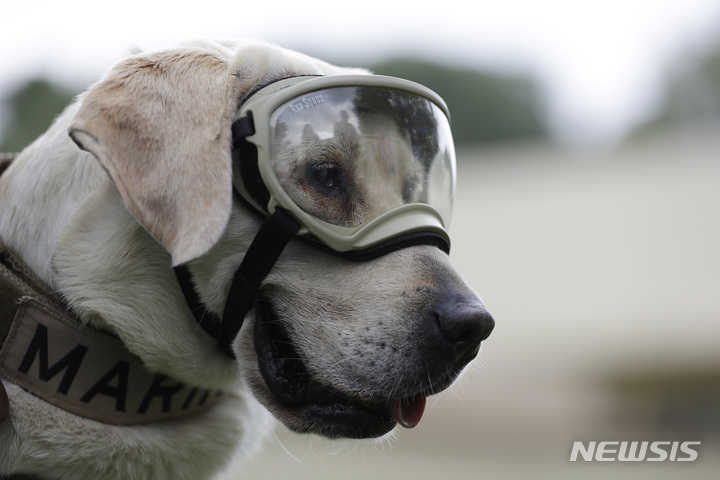 [멕시코시티=AP/뉴시스] 멕시코 해군은 2017년 9월 19일 멕시코 지진 당시 뛰어난 활약으로 국민 영웅견으로 떠오른 후 2019년 은퇴했던 구조견 래브라도 리트리버 '프리다'가 자연사했다고 15일(현지시간) 발표했다. 해군은 '프리다'가 현역 시절 현장에서 최소 41구의 시신을 찾아내고 12명을 구조했었다고 밝혔다. 사진은 '프리다'가 2017년 9월 28일 멕시코시티에서 열린 언론 행사 중 보안경을 착용한 모습. 2022.11.16.