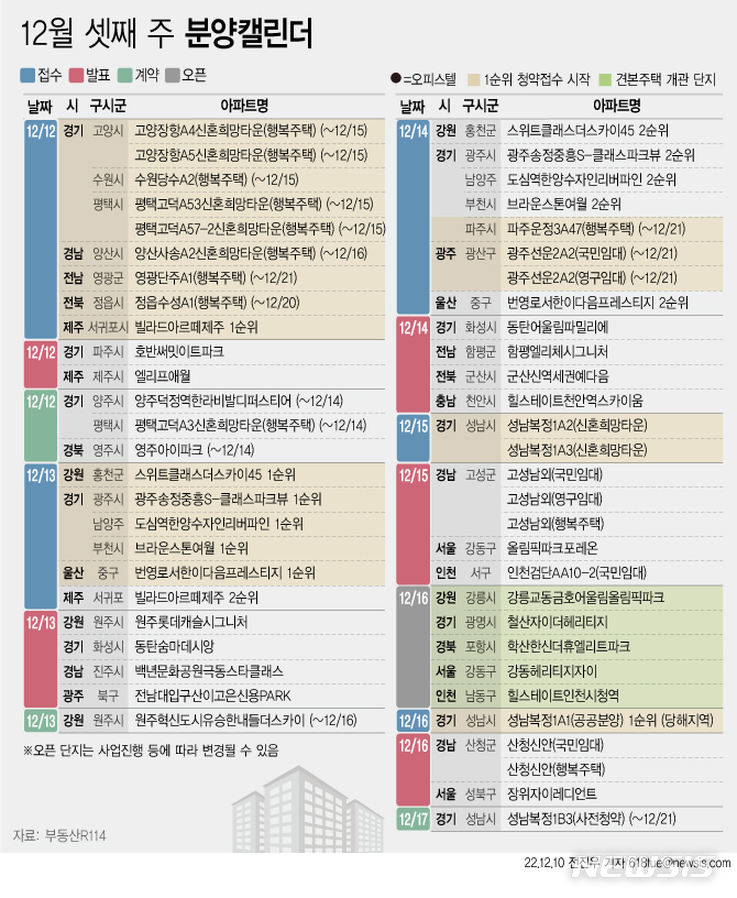 [서울=뉴시스] 10일 부동산R114에 따르면 12월 셋째 주에는 전국 20개 단지에서 총 7982가구(일반분양 2016가구)가 분양한다. (그래픽=전진우 기자)
