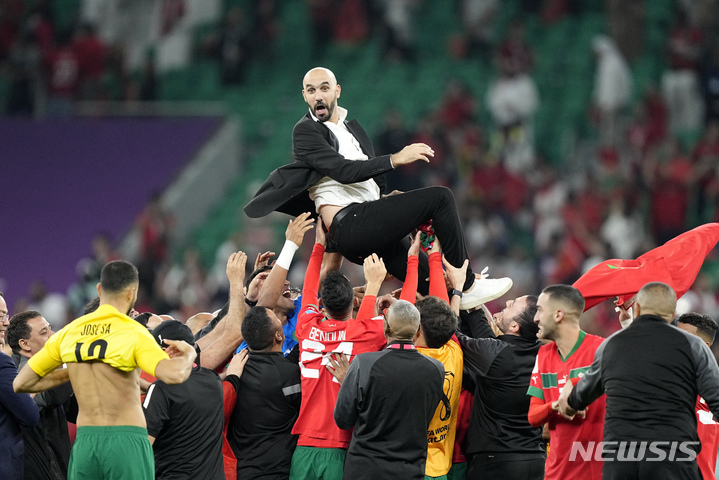 [도하=AP/뉴시스] 모로코 선수들이 10일(현지시간) 카타르 도하의 알 투마마 스타디움에서 열린 2022 카타르 월드컵 8강전에서 포르투갈을 물리친 후 왈리드 라크라키 감독을 헹가래 하고 있다. 모로코는 유세프 엔네시리의 전반 42분 선제 결승 골을 앞세워 포르투갈을 1-0으로 꺾고 아프리카 사상 첫 4강에 진출하는 이변을 일으켰다. 2022.12.11.