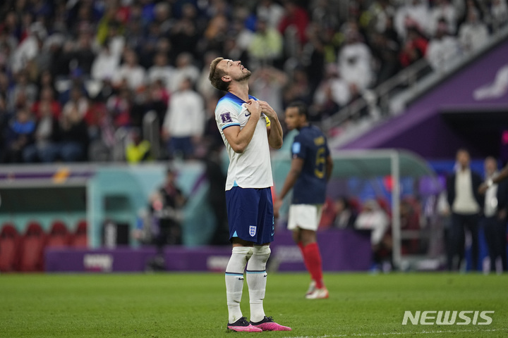 [알코르=AP/뉴시스] 잉글랜드의 해리 케인이 10일(현지시간) 카타르 알코르의 알바이트 스타디움에서 열린 2022 카타르 월드컵 프랑스와의 8강전에서 1-2로 패한 후 아쉬워하고 있다. 케인은 후반 36분 PK를 실축하며 동점 기회를 놓쳤다. 2022.12.11.