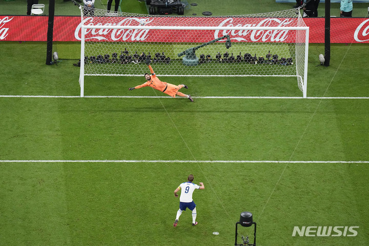 [알코르=AP/뉴시스] 잉글랜드의 해리 케인이 10일(현지시간) 카타르 알코르의 알바이트 스타디움에서 열린 2022 카타르 월드컵 프랑스와의 8강전 후반 36분 페널티킥을 실축하고 있다. 2022.12.11.