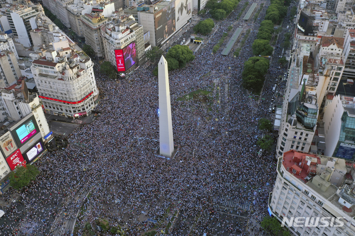 [부에노스아이레스=AP/뉴시스] 13일(현지시간) 아르헨티나 부에노스아이레스 광장에 모인 축구 팬들이 아르헨티나가 2022 카타르 월드컵 준결승전에서 크로아티아를 꺾은 후 기뻐하고 있다. 아르헨티나는 크로아티아를 3-0으로 꺾고 8년 만에 결승에 올랐다. 2022.12.14.