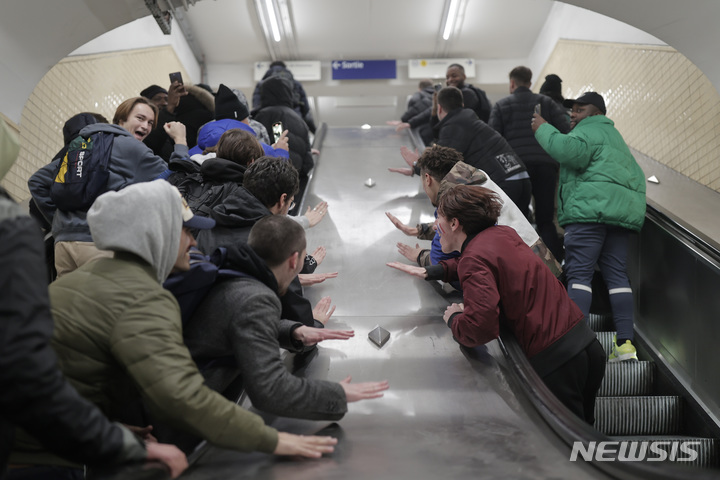[파리=AP/뉴시스] 14일(현지시간) 프랑스 파리의 한 지하철역 승강기에서 시민들이 프랑스 축구 대표팀의 2022 카타르 월드컵 모로코와의 준결승 승리에 환호하고 있다. 2연패를 노리는 프랑스는 모로코를 2-0으로 꺾고 결승에 올라 아르헨티나와 우승을 다툰다. 2022.12.15.