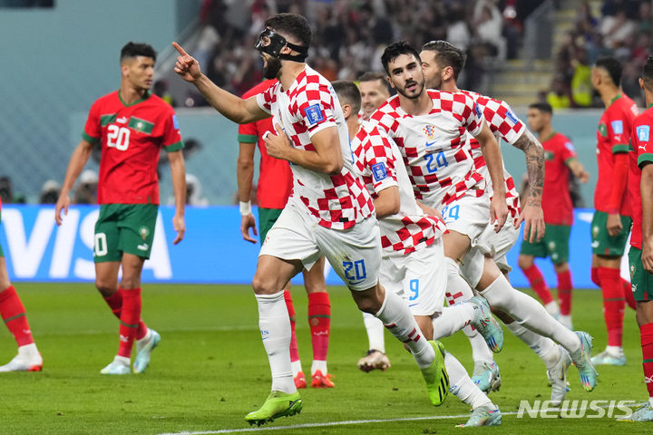 [도하=AP/뉴시스] 크로아티아의 요슈코 그바르디올(앞)이 17일(현지시간) 카타르 도하의 칼리파 인터내셔널 스타디움에서 열린 2022 카타르 월드컵 모로코와의 3·4위 결정전 전반 7분 선제골을 넣고 환호하고 있다. 2018 러시아 월드컵 준우승팀인 크로아티아는 모로코를 2-1로 꺾고 동메달을 목에 걸었다. 2022.12.18.