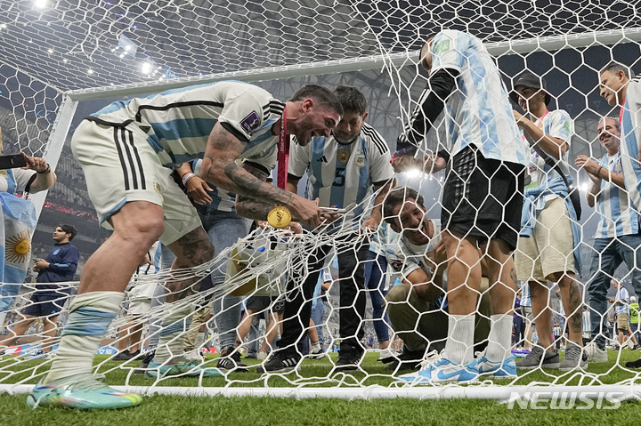 [루사일=AP/뉴시스] 아르헨티나 선수들이 18일(현지시간) 카타르 루사일 스타디움에서 열린 프랑스와의 2022 카타르 월드컵 결승전에서 승리, 우승을 차지한 후 기념용으로 골망을 잘라내고 있다. 아르헨티나는 연장 3-3 무승부 끝에 승부차기로 프랑스를 4-2로 누르고 36년 만에 정상에 올랐다. 2022.12.19.