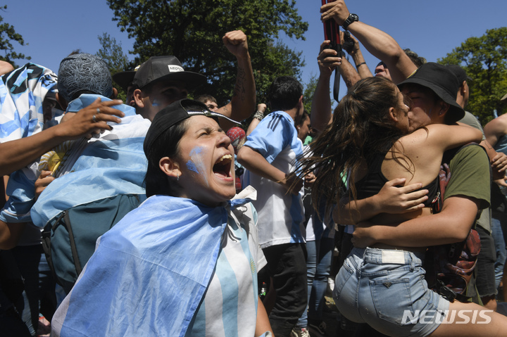 [부에노스아이레스=AP/뉴시스] 아르헨티나 축구 팬들이 18일(현지시간) 부에노스아이레스에서 거리 응원을 하며 아르헨티나의 2022 카타르 월드컵 우승에 환호하고 있다. 아르헨티나는 결승전에서 프랑스를 승부차기 끝에 4-2로 꺾고 36년 만에 정상에 올랐다. 2022.12.19.