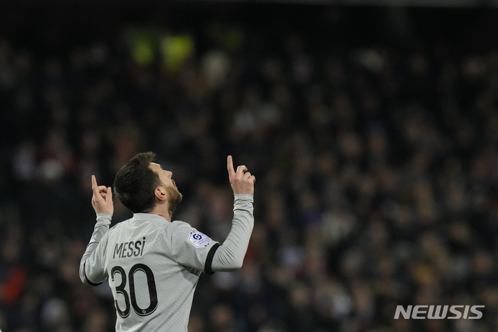 [몽펠리에=AP/뉴시스] 파리 생제르맹(PSG)의 리오넬 메시가 1일(현지시간) 프랑스 몽펠리에의 스타드 드 라 모송에서 열린 2022-23시즌 프랑스 리그1 21라운드 몽펠리에와의 경기 후반 26분 팀의 두 번째 골을 넣고 기뻐하고 있다. 메시의 골은 결승 골이 됐으며 PSG가 3-1 승리를 거두고 1위 자리를 지켰다. 2023.02.02.