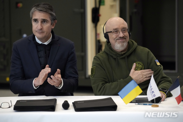 [파리=AP/뉴시스] 올렉시 레즈니코우(오른쪽) 우크라이나 국방장관이 1일(현지시간) 프랑스 파리 외곽에 있는 탈레스 그룹의 레이더 공장을 방문해 세바스티앙 르코르뉘 프랑스 국방장관, 파트리스 켄(왼쪽) 탈레스 그룹 회장과 합의서에 서명한 뒤 웃음 짓고 있다. 프랑스는 우크라이나에 250㎞ 떨어진 항공기를 탐지할 수 있는 그라운드 마스터(GM200) 레이더를 제공하기로 했다. 2023.02.02.