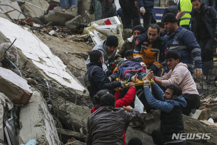 [아다나=AP/뉴시스] 6일(현지시간) 튀르키예 남부에서 발생한 규모 7.8의 강진으로 아다나에서 구조대와 주민들이 무너진 건물 잔해에 있던 생존자를 구조해 옮기고 있다. 이번 지진으로 지금까지 튀르키예에서 최소 76명, 시리아에서 최소 99명이 숨진 것으로 나타났다. 2023.02.06.