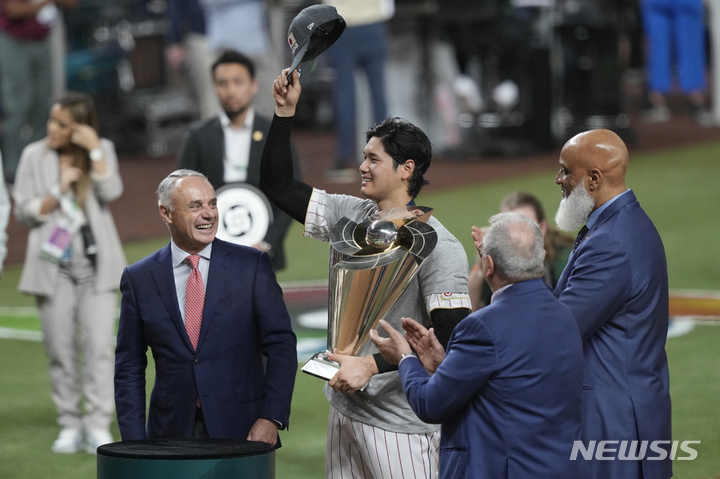 [마이애미=AP/뉴시스] 일본의 오타니 쇼헤이(가운데)가 21일(현지시간) 미 플로리다주 마이애미의 론디포 파크에서 열린 2023 월드베이스볼클래식(WBC) 결승전에서 일본이 미국을 꺾고 우승한 후 WBC 우승컵을 받아 들고 팬들에게 인사하고 있다. 일본은 미국을 3-2로 꺾고 이 대회 통산 세 번째 우승을 차지했다. 2023.03.22.